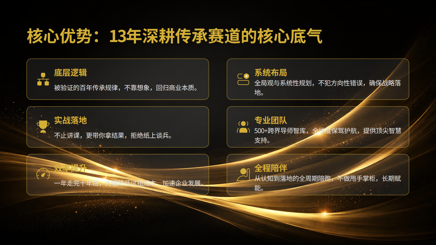 “定制化接班人陪跑”概念率先提出打破传统咨询与培训的局限,提供深度介入、长期陪伴、结果导向的个性化赋能服务,真正做到“扶上马,送一程”。